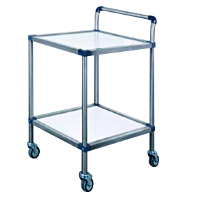 DRESSING TROLLEY • With 2 removable trays • Constructed from stainless steel • Push handle one side from stainless steel • Mounted on castors 80 mm • Two removable trays from laminated plastic white • 61 x 43 x 78 h cm